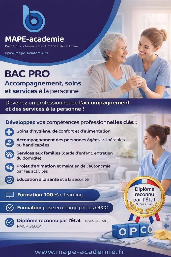 Le Bac Pro Accompagnement, Soins et Services à la Personne forme des professionnels capables de prendre en charge des personnes de tout âge, malades, dépendantes ou en situation de fragilité. La formation allie compétences relationnelles, savoir-faire technique et expérience pratique en milieu professionnel.