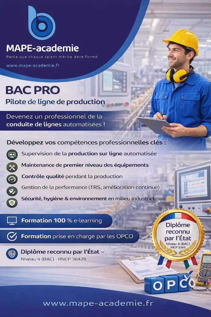 Le Bac Pro Pilote de Ligne de Production forme des professionnels capables de conduire et surveiller une ligne de fabrication automatisée, d’assurer la qualité des produits et la maintenance de premier niveau.