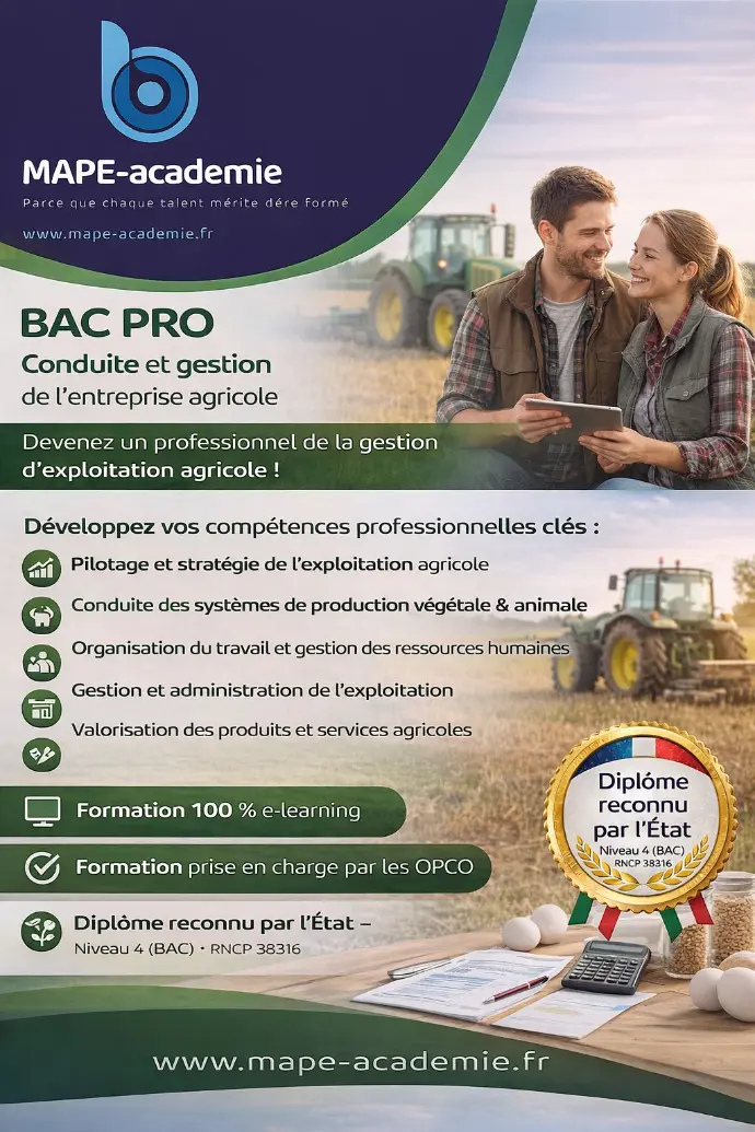 Le Bac Pro Conduite et Gestion de l’Entreprise Agricole forme des professionnels capables de conduire une production agricole, d’en assurer la gestion technique, économique et administrative, et de piloter une exploitation dans une démarche durable. La formation combine savoirs agricoles, gestion d’entreprise et expérience pratique sur le terrain.