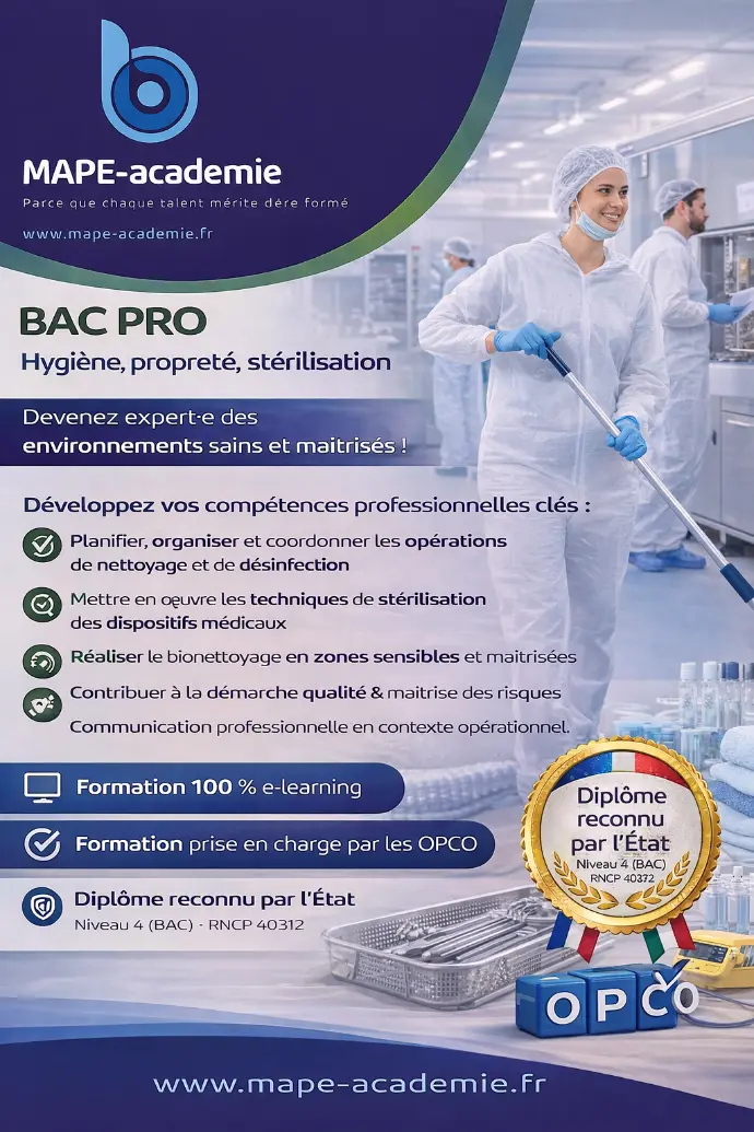 Le Bac Pro Hygiène, Propreté et Stérilisation forme des professionnels capables d’assurer la propreté, l’entretien et la désinfection des locaux et équipements dans le respect des normes d’hygiène et de sécurité.