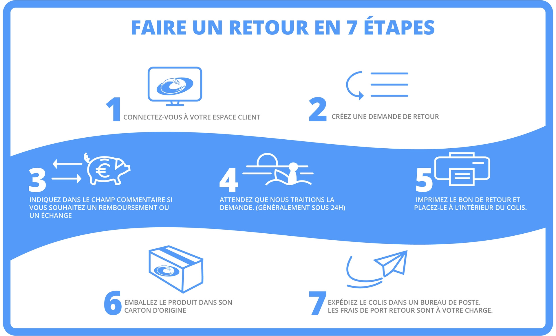 Calcul du montant à rembourser (frais de port, frais de gestion), délai de traitement, mode de remboursement, proposition d'échange alternatif.