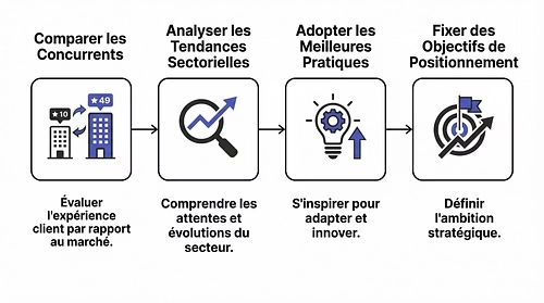 Un plan d’action bien structuré relie donc l’analyse des données à des transformations concrètes. En hiérarchisant les priorités, en fixant des objectifs mesurables, en désignant des responsables, en planifiant les étapes et en maîtrisant les ressources, l’entreprise se donne les moyens d’améliorer durablement la satisfaction. Cette dynamique ouvre naturellement la voie à une comparaison avec le marché afin d’évaluer son positionnement et d’identifier de nouvelles opportunités de progression.