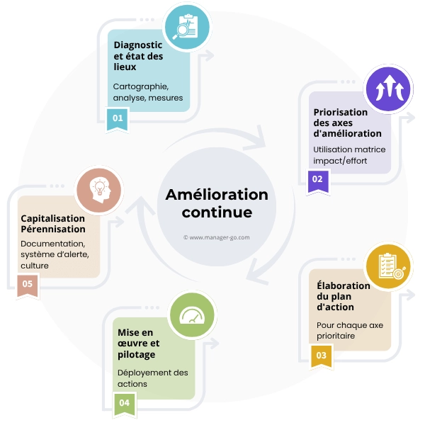 Boucle d'amélioration (mesure, analyse, action), suivi des résultats, communication interne, impliquer les équipes.