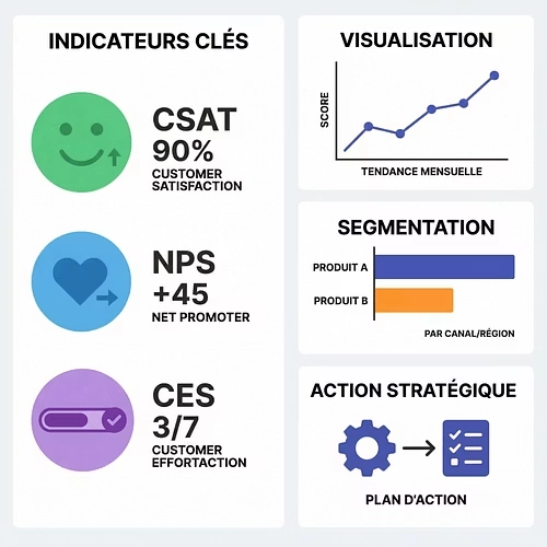 Indicateurs clés (CSAT, NPS, CES), représentation visuelle, suivi de l'évolution, segmentation par produit/canal/région.