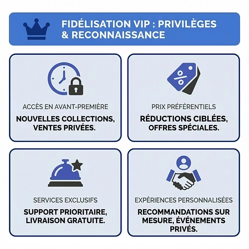Les services exclusifs jouent un rôle majeur dans la fidélisation VIP, car ils offrent une valeur perçue forte sans forcément impacter directement la marge. Cela peut inclure une livraison gratuite, un service client prioritaire, un conseiller dédié ou des retours simplifiés. Dans le secteur du luxe, une maison comme Louis Vuitton mise beaucoup sur la qualité du service personnalisé pour fidéliser ses clients. Même dans des secteurs plus accessibles, proposer un support premium ou une assistance dédiée peut faire la différence. Des solutions comme Zendesk ou Freshdesk permettent d’organiser un service client différencié selon les niveaux de fidélité. Une astuce consiste à identifier les points de friction du parcours client et à offrir des services VIP précisément sur ces aspects. L’erreur courante est de promettre un service exclusif sans pouvoir réellement le délivrer, ce qui génère frustration et perte de confiance.